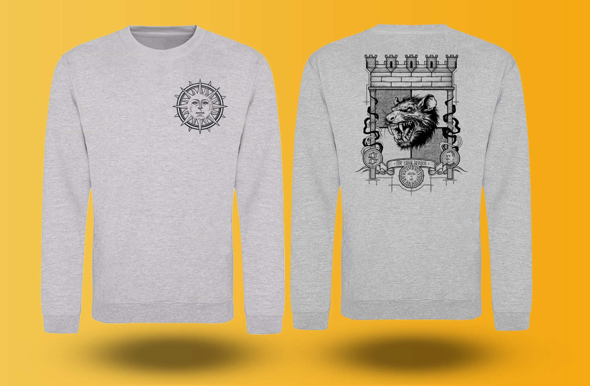 Trycket är inspirerat av heraldik/träsnitt. Förr i tiden fanns inte samma tillgång till hållbara färger, så man använde mönster för att representera dem. I denna design symboliserar rutorna bakom råttan svart och prickarna guld/gult, precis som i klassisk heraldik.